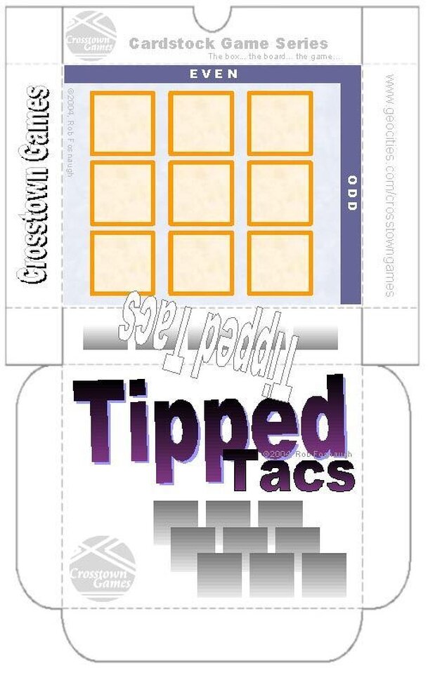 From the Crosstown Games website: Tipped Tacs is a game of tic-tac-toe using die faces as the instrument of victory. The die are not placed individually on the grid as in normal tic-tac-toe, but 'tipped' based on strategy. A die has only one valid direction to tip each turn, so deciding which die to tip and when… that is the key to master. Number of...