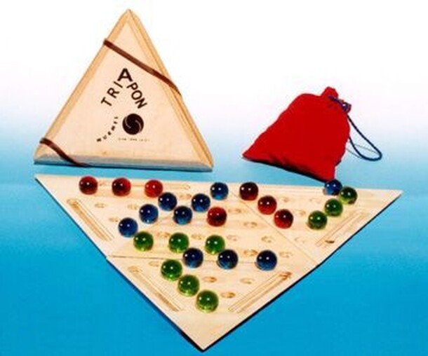 Triapon This abstract game is played on a triangular board with 45 holes (the longest row has 9 holes, the tip has one). It can only be played by 3 players exactly, and is, in essence, "Nine Men's Morris" for three. Each player gets 9 playing pieces and play starts with placement of these pieces onto the board. Clockwise, each player places a piece onto a...