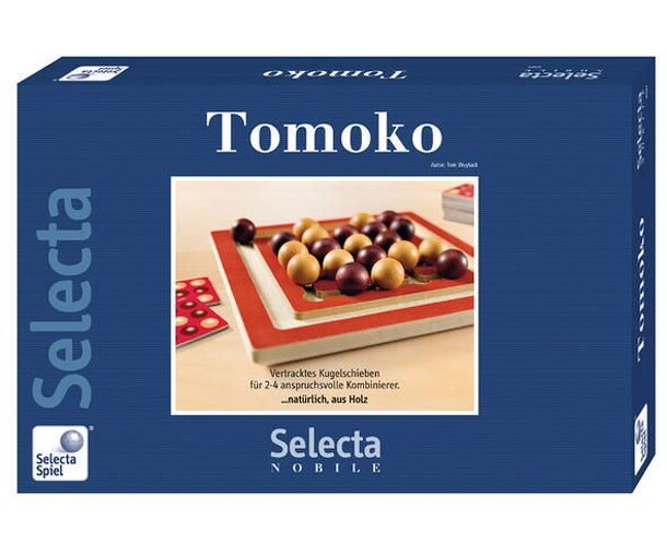 Tomoko ... a convoluted ball-rolling game for 2-4 sophisticated tacticians - that includes: 1 game board, 30 wooden balls, 36 pattern cards, 1 cotton bag, large print instructions. Each player receives two pattern cards - both of which show a pattern of 9 balls. Players try to achieve their patterns by pushing balls onto the board. The card is laid on the...