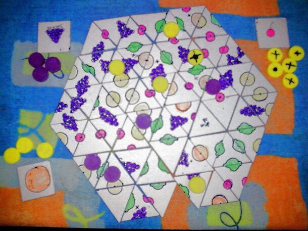 This is a simple and fun triangular tile matching game for 2, 3 or 4 players. Each player selects one of the four Fruits and tries to collect the greatest amount of point until all the tiles have been used. Each side of the triangular tiles has a half of a fruit or a blank space. You can accumulate points putting together 2 halves of your own fruit or...