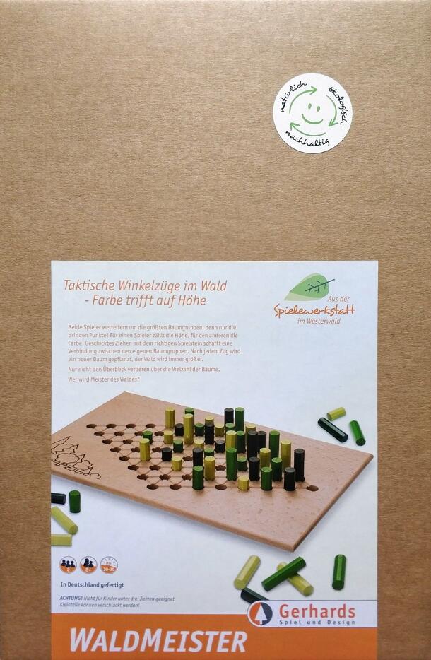 In WaldMeister, you want to shape the forest to suit your own ends. Each player starts the game with 27 pegs, with the pegs coming in three heights and three colors, and with three pegs of each combination, e.g., short and yellow-green. Players take turns moving and placing pegs on the game board, with one player trying to create clusters according to...