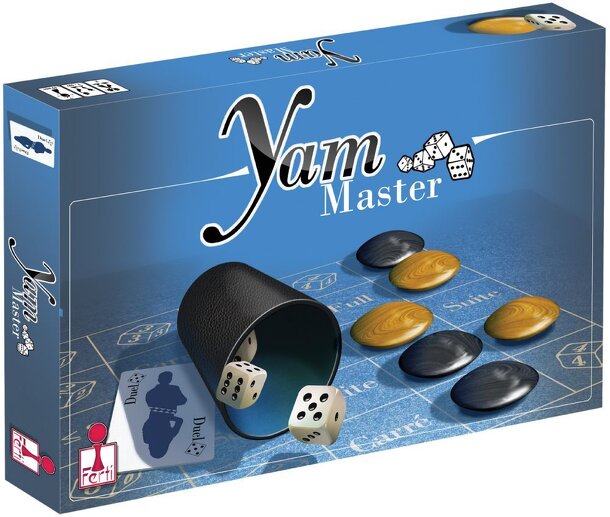 Yam Master combines the dice-combination game play of Yahtzee and other such designs with a competition for prime spots on the game board in order to create rows of tokens. On a turn, a player rolls the five dice, setting aside any he wishes, then rolls up to two more times with dice set aside in the first round being available for reroll on the third...