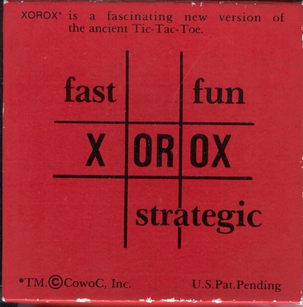 The game is a variation of TicTacToe. Players play six games and score points. There are 16 ceramic tiles one inch square. 4 black with “X”, 4 black with “XO”, 4 white with “X” and 4 white with “XO”. There are no tiles with just “O”. Players score points by making a line of three tiles of same color (25 pts), 3 Xs or 3 XOs in a line of two colors (50 pts)...