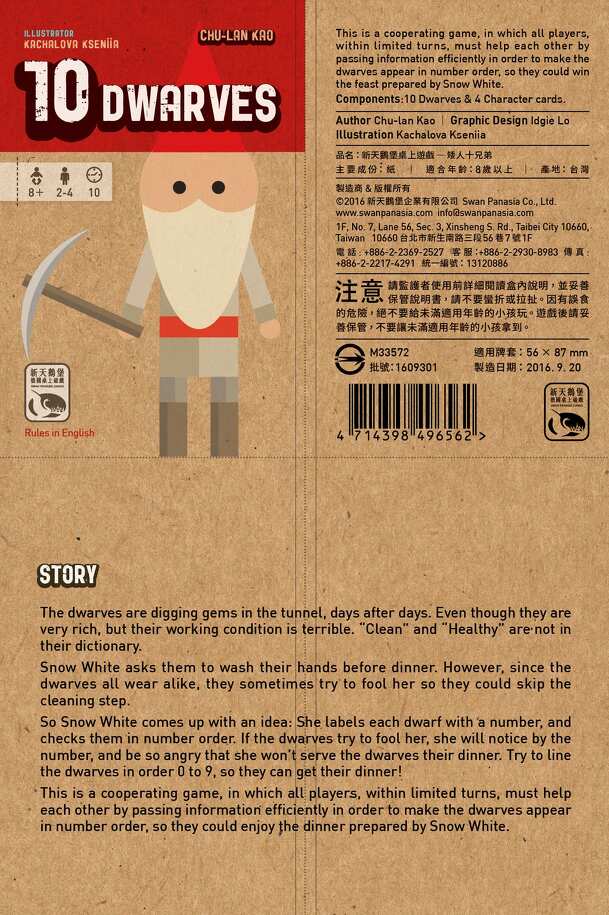 In 10 Dwarves, you're playing as characters from the novel Snow White. All players have a character card with a special ability that is a one-time use. The players take turns drawing two cards from the table, choosing to keep one card and return the other to the table, both cards face-down. Then the player must say how the two cards relate to each other;...
