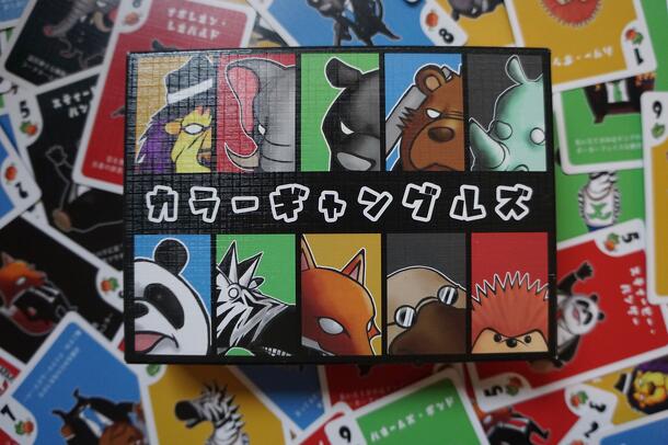 カラーギャングルズ (Color Gangsters) is a trick-taking game in which players attempt to meet certain conditions while playing through their hand of cards. To set up the game, shuffle the sixteen tiles, then lay out nine of them at random in a 3x3 grid. Each tile has a different condition on it that a player must meet in order to claim the tile. Players each receive...