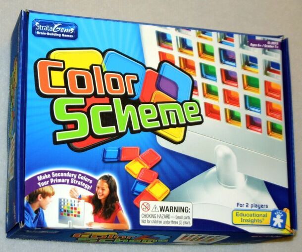 Players choose a secondary "target" color (orange, green or purple) and then use primary colored tiles to blend colors and get three of their target-colored tiles in a row (either vertical, horizontal or diagonal). The board resembles the classic Connect Four as you drop tiles slots. However each location on the 5×6 grid has room for 2 of the colored...