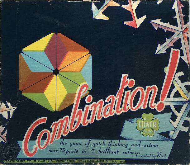 This 1941 game published by Clover Games Inc. consists of 48 triangular tiles bearing different combinations of six colors on each of their three sides. The rules say to place all the tiles face down in the center of the table. Each player initially draws six. Players then in turn draw from one to three triangles each turn until one player can form a...