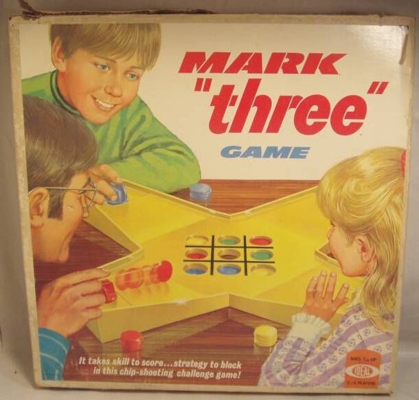 IDEAL's treatment of tic-tac-toe enclosed in a large 18" square box. The large plastic gameboard consists of four gently sloping ramps which extend upward from each side of a tic-tac-toe grid. There is a circular hole in the center of each grid segment to accept players' discs. Each player is given eight plastic discs of their chosen color and a device to...
