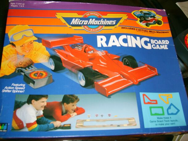 From the back of the box: Micro Machines Racing Board Game Featuring Actino Speed Shifter Spinner Ages: 5 and up Players: 1 to 6 Object of the Game: Be the first player over the finish line or the player to finish 3 laps around the track. Equipment: 2 Micro Machines 4 Game Movers 4 Game Mover stands 24 pieces of game track 1 Speed Shifter Spinner 12 Lap...