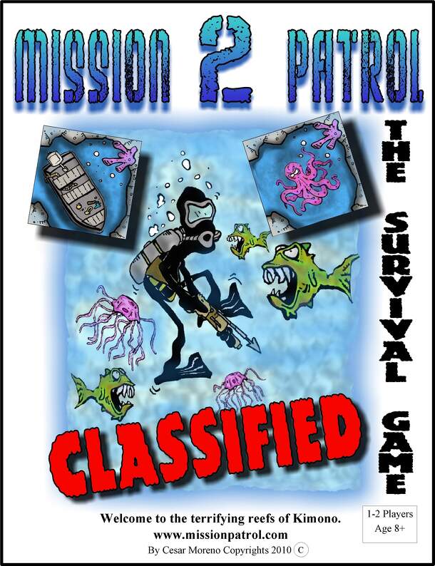 MISSION PATROL 2 PRINT & PLAY UNDERWATER GAME. Mission Patrol 2 is a game that is played with card tiles that you withdraw and roll dice to determine your fate. Your mission to find and locate your targets and set the detonators in the reefs of Kimono and destroy the flesh eating infested sea creatures. The timer's ticking so hurry and reach for the safety...