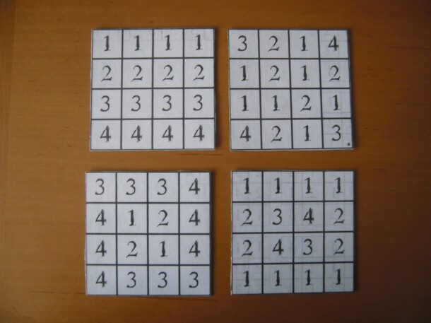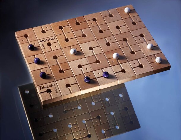 A 2 player abstract game using a board made from separate square tiles, with channels at right angles to control movement, on both sides of each tile. Players must get 4 of their 5 pieces across the board and can rotate a tile 90 degrees each turn. The trick in the game is that you can move on the paths over the tiles, then move on the paths underneath the...