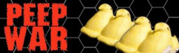 Peep War! is a downloadable miniatures-based wargame that uses Marshmallow Peeps and jellybeans instead of expensive plastic and pewter miniatures. It is avaliable for free at http://www.invisible-city.com/play/156 Each player begins with a number of Peeps and jellybeans, and a supply Center. The game ends when one player has seized 80% of the supply...