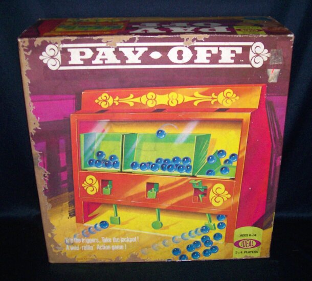 Game comes in a 14 1/2" x 14 1/2" x 5 1/4" box and requires assembly. The plastic Pay Off contraption, once assembled, vaguely resembles a kind of lolly machine from the Wild West. Three catch-triggered compartments sit behind a transparent plastic window with a small target located centrally beneath each. In each compartment there are one or more marbles....