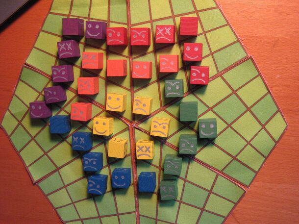 From the box: "It's a simple game, just race across and back again. Shake the dice and move your snake, but then some care you'll have to take. Round the tree you'll have to go, see what colour you can throw." Each player has a snake which consists of six plastic hexagons and a head piece. Players are also given a tree, the hexagonal base of which matches...
