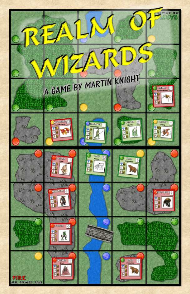 Realm of Wizards is a game for 2-4 players. Each wizard is assigned an element, earth (green), air (yellow), fire (red) and water (blue). The wizards summon creatures to fight to the death. The winner is the last player left in the game. A board section is supplied for each wizard that is partaking in the game and places it at the start of the game. Each...