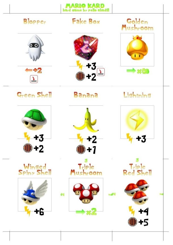 Mario Kard Mario Kard is a free PnP version of the popular Mario Kart videogame saga. So, this is a racing game composed of four kind of cards: 1. Road Cards destinated to make modular circuits. 2. Object Cards representing special items that drivers can use for themselves or against the others, these are the well known shells, mushrooms, stars,... 3....