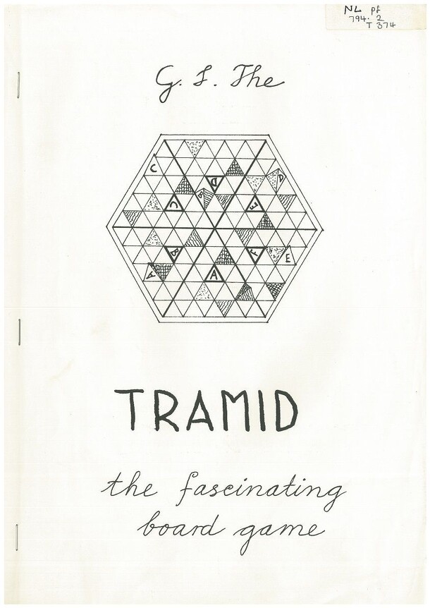 "The fascinating boardgame" Abstract race game played with tetrahedral pieces on a hexagonal board divided into six large equilateral triangle regions, each of which is subdivided into 25 equilateral triangles which are the movement spaces. The centre triangle in each of the 6 larger triangles regions is marked with a letter of the alphabet (A through F)...