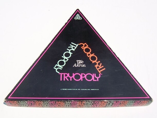 Tryopoly is a property-purchasing game -- similar to Monopoly -- but played on a triangular board, with hexagonal tiles that are placed on the board as the game progresses. Players roll a die and move 1 to 3 spaces towards the red corner or the blue corner of the board, depending on which color was rolled. Property tiles may be bought and placed onto empty...