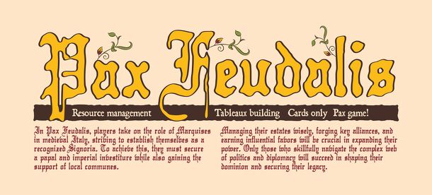 Pax Feudalis places players in the role of rising Marquises in 13th-century Italy, a land fractured by rival factions, political turmoil, and constant power struggles. Each player builds a personal tableau of characters, constructions, and influences, all represented by cards. The game’s tension comes from balancing your resources, expanding your engine...