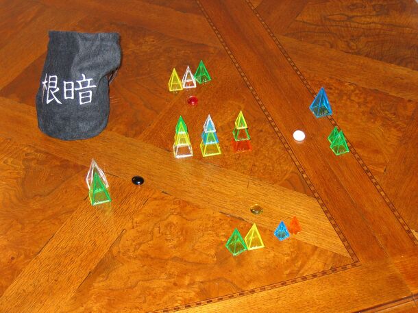 Undercut is a game created using Icehouse Pieces. It's an auction game where the players score points based on sets of similar pieces, but the twist is that the player with the lowest score wins. During each round, players are required to bid on a set of pieces, and it is desirable to win the auction on the set of pieces which most avoids matching pieces....