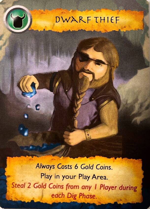 Dwarf Thief is a promo card for DIG: the Card Game that can be added to the deck for more game play variety. Simply shuffle the card into the starting deck and play. The pertinent rules are included on the card itself. Card Text: Always costs 6 Gold Coins. Play in your Play Area. Steal 2 Gold Coins from any 1 Player during each Dig Phase. Note: The Dwarf...