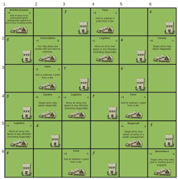 Fiefdoms is a 2-4 player dice based, area control-type game. Each turn players roll four dice from which they create two grid references - determining where on the six-by-six map they can place armies and workers; occupying castles to gain points or controlling villages to gain extra powers. Once placed, your armies will have to fight for the most...