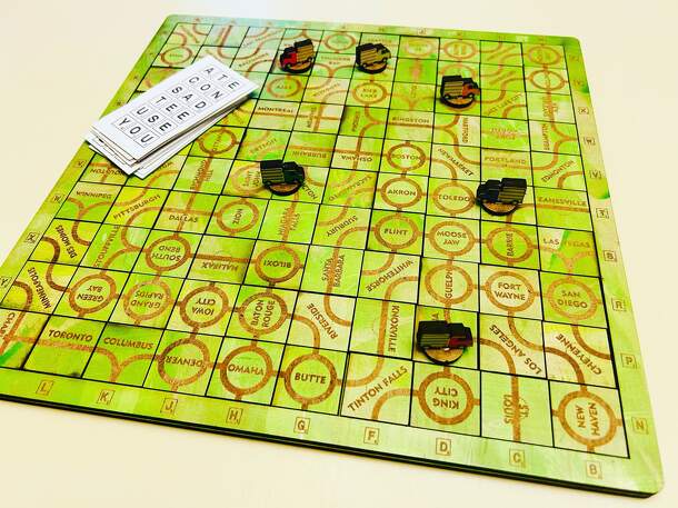 Travel North American city routes picking up wordy packages. A manifest indicates what needs to be picked up. Packages are identified by the letters in the manifested words and are taken from the adjacent cities on your route. "Route Words" is a word game where you travel from city to city collecting letters to make words. One to six or more players...