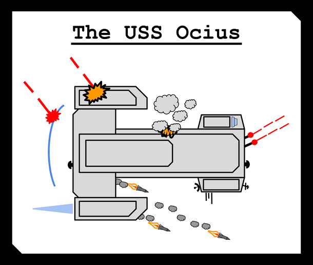 You and your party are the Officers that operate the USS Ocius [äk-E-uhs], an Akula Class mining and discovery vessel. The game begins as the Ocius comes under unexpected fire. Having just exited orbit around Planet Kalos, the Ocius is caught off-guard and badly damaged. The much larger and more powerful Zophosian ship will not stop firing until the Ocius...