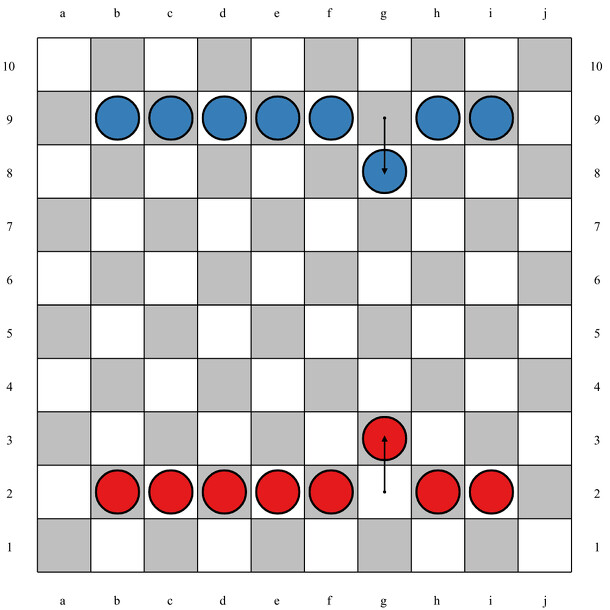 Mitozo is an turn-based abstract strategy game with an oriental flavour, designed by Pablo Soto Cid. It was designed as a pen and paper game for two players, but can be played with a regular square board and "white/black" pieces. Players take turns to fill every position on the game grid, with only one rule: if the piece to be placed is going to contact...