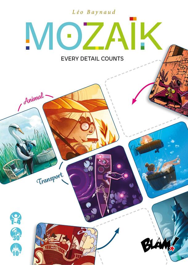A game of Mozaïk consists of 9 rounds, during which each player has to create a personal grid of 9 images and 9 words to match as closely as possible. The images must form a 3x3 square, and the words are placed around the square, at the ends of the rows/columns (maximum one word per end). Each word earns more or fewer points depending on its difficulty...