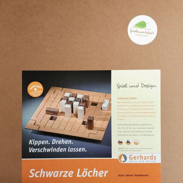 A three-dimensional challenge - from solid wood Is played on a lavishly designed game board made of solid oiled beech and the pieces being walnut and maple. Four wells, the "black holes", are refined with dark felt. The aim is to bring the first player to own four of the pieces in the right position before the "black holes" and to sink. One's playing...