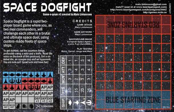 Space Dogfight is the second game in the Game-o-gram series. All games in the Game-o-gram series should fit on a postcard and should preferably contain everything needed to play. The basic idea of the game is that it should be cheap enough for everyone to buy, easy enough for everyone to play and interesting enough to play over again. Space Dogfight is a...