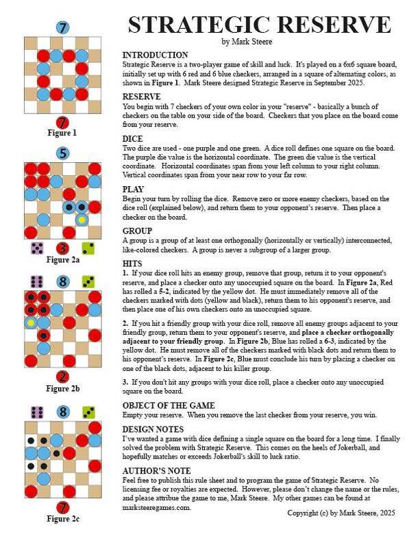 Strategic Reserve is a game of skill and luck. The 6x6 square board is initially set up with 6 red and 6 blue checkers, arranged in a square of alternating colors. You begin with 7 checkers of your own color in your "reserve." Begin your turn by rolling the dice. A dice roll defines one square on the board. Remove zero or more enemy checkers, based on the...