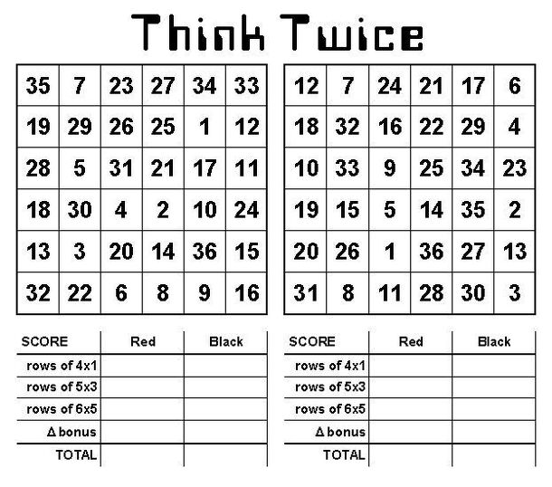 Think Twice is played on two 6x6 grids each filled with the numbers 1-36 - each player fills one grid as they wish before the game starts. On a turn a player selects one of the numbers and fills in the corresponding space on each grid. This continues until all the spaces are filled. Players score for lines of four, five, and six in any direction. In...