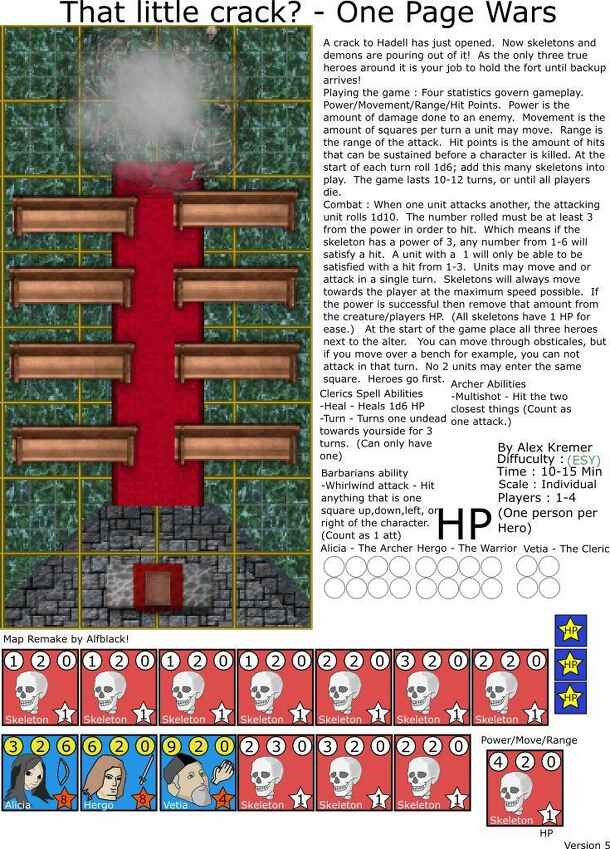 From the One Page Wars game series. "A crack to Hadell has just opened. Now skeletons and demons are pouring out of it! As the only three true heroes around, it is your job to hold the fort until backup arrives." A One Page Wars series game. A barbarian, cleric, and archer fight a growing pack of skeletons in a narrow church. Each unit and monster is rated...