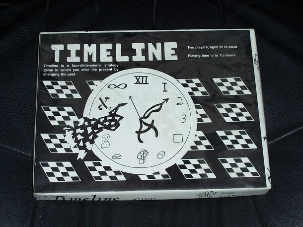 A "time-travelling" 4-dimensional chess variant played on a grid of 16 miniature chessboards. Each player has 2 rooks and 2 bishops, each in its own warm or cool color. As each piece moves, it literally leaves a paper trail of cardboard chits showing its progress through the game. A piece can be captured at any point on its timeline by landing on a square...