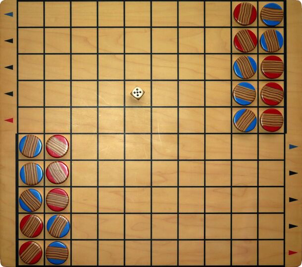 Traverse is played on a square "checker" game board with a 12 1/2" x 12 1/2" grid. Each player chooses one color of playing pieces. Each player has eight pieces of the same color: 2 squares, 2 diamonds, 2 triangles, and 2 circles. Each player arranges their pieces in ANY ORDER within their starting row. The object of the game is to get ALL of your pieces...