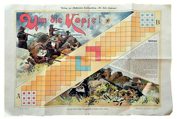The playing consists of a square grid, on which two enemy commandos face each other. The one in A is the red command, the other in B is the blue command. In the middle is a kopje to fight for possession of. The winning command is the first to occupy the 5 squares framed with the color of the command. 9 figures of each color are required, which are placed...