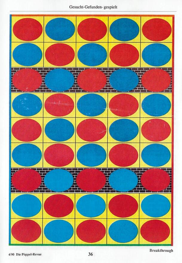 Breakthrough is played on a 5x9 board. Each player has ten pieces which start in the rows nearest them. The object is to get a piece to the row farthest away from you. On a turn a piece can move any distance diagonally as long as it does not pass over any piece or land on an opponent's piece. The fourth and seventh rows of the board are "wall" rows, and...