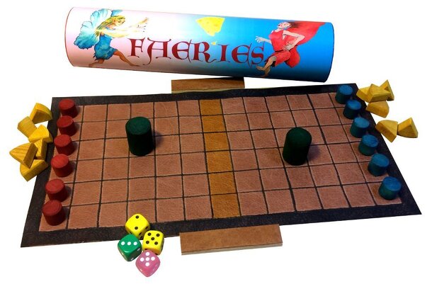 Description from the publisher: Faeries race from opposite ends of the board for the safety of the central line while bombarding each other with cheese. Helpful trolls blunder about, collecting up the cheese to replenish the faeries' cheese stock, but also impede their faerie friends' progress. The game comprises a leather board (11 x 5.5”) and...