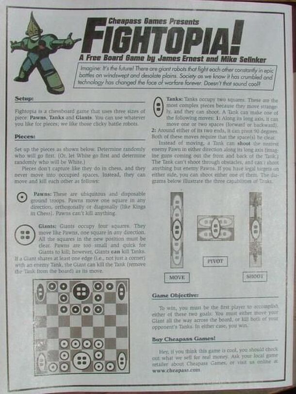 Fightopia! from Cheapass Games was published in issue #50 of Game Trade Magazine, page 64. Taking place on a chess board, the game depicts futuristic combat between giant robots. Each player has ten Pawns (which are used for blocking), two Tanks (which can destroy pawns), and one Giant (which can kill tanks). To win, you must either move your Giant all the...