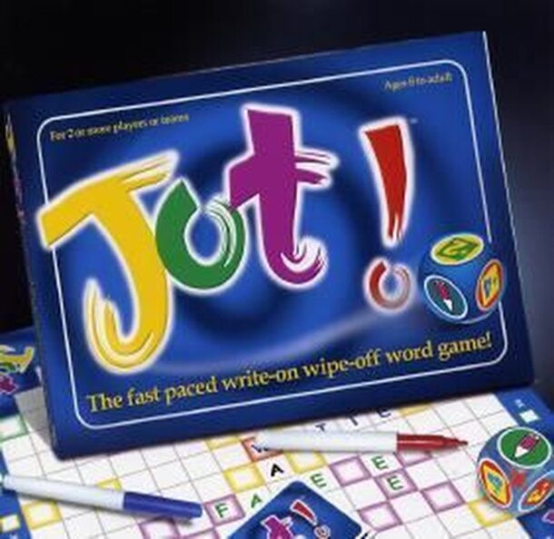 Jot is a Scrabble-like game, played on a "write-on, wipe-off" board with special pens. Rather than building words from a limited number of letters, each player first rolls a special die, which serves both to dictate the limits of his/her word, and as a one-minute timer. (The die itself is pressure-sensitive, and will start timing when rolled.) Players must...