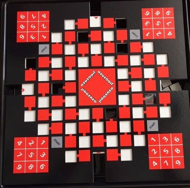Easy to learn, simple to play, yet always a challenge. Complete your puzzle and find your mastercard to win...but move the wrong way and you could be jiggered. In Jiggered, players traverse a board with their markers collecting numbered personal puzzle pieces in order, then finally their mastercard. Dice is used for movement, but rolling a six means the...