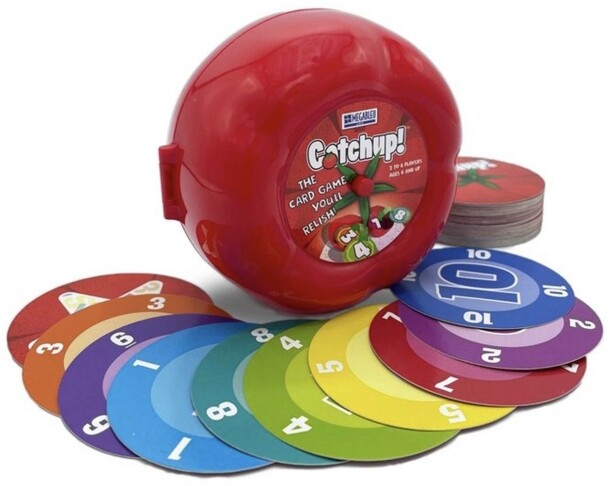 Catchup! is a fast-paced card game where players race to get rid of the cards in their hand. Open up the tomato case and place a card into each half. Race to drop your number cards in order, either up or down. All players play at the same time, so the game can change in an instant. The first player to discard all their cards wins! Can you think fast or...