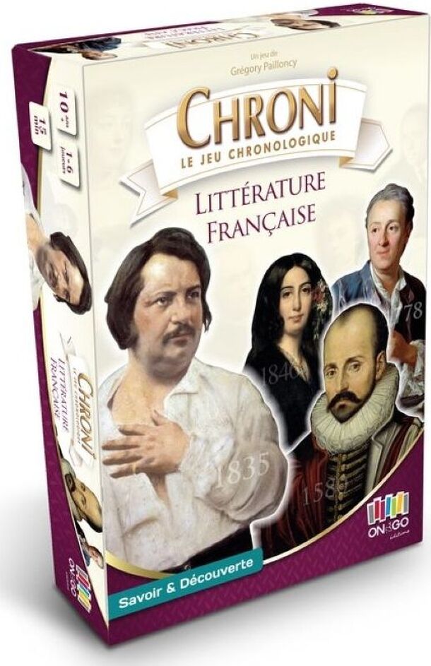 Chroni: Littérature Française' ("Chroni: French Literature") is a knowledge card game that will allow you to discover and test your literary culture, without having to read all the books and pretending to. From the Song of Roland, dating from around 1100, to Jean-Marie Gustave Le Clézio's The Gold Digger in 1985, this game highlights 60 great works of...