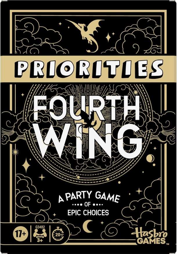 Welcome to Basgiath, cadet! See how well you know your squadmates in this Priorities Fourth Wing Edition game, inspired by the bestselling Empyrean series by Rebecca Yarros! In this game of epic choices, one player – the Wingleader – draws 5 cards featuring favorites from the first 3 Empyrean books: Fourth Wing, Iron Flame, and Onyx Storm. They secretly...