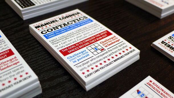 Contactics is a business card with a set of rules which allow you to play an area control boardgame in which the components are other business cards. Each player's stack of business cards is shuffled into a deck, and a hand of 6 is drawn. The list on the back of Contactics uses a sequence of four questions to define which effects your card has. Each turn a...