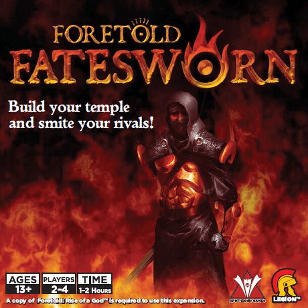Fatesworn is an expansion to Foretold: Rise of a God in which players take on the role of a deity who gathers followers, builds a temple and then smites rival gods. Foretold is a deck-building game with a tower defense element. During the game you may purchase cards or tiles from the Marketplace to grow your followers and your temple. Players may raid a...