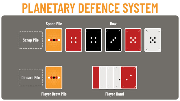 A game made for the Dice Deck by We Heart Games. In this solo deckbuilder, a large group of meteors are heading straight for earth! Build up your defence system to ward them off before they strike. Use white cards to buy new cards from the row, and red cards to damage the black meteor cards in the row. After every turn, new cards cover any cards remaining...