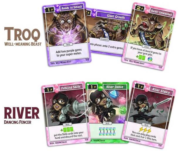 This promo pack contains two new characters: Troq, the Well-Meaning Beast and River, the Dancing Fencer. It was originally included as part of the Puzzle Strike 2 Kickstarter as well as orders directly from Sirlin Games. Troq's Character Cards Ready to Smash - Add two purple gems to your super meter. Giant Growth - Ante two extra gems (this card's effect...